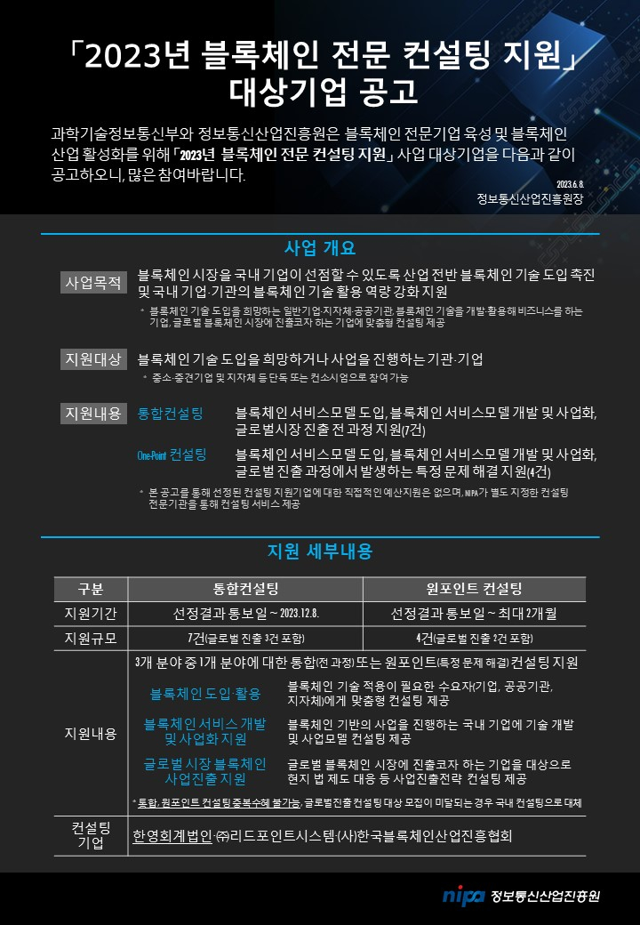 | 제목 | [NIPA] 2023 블록체인 전문 컨설팅 지원사업 | ||||