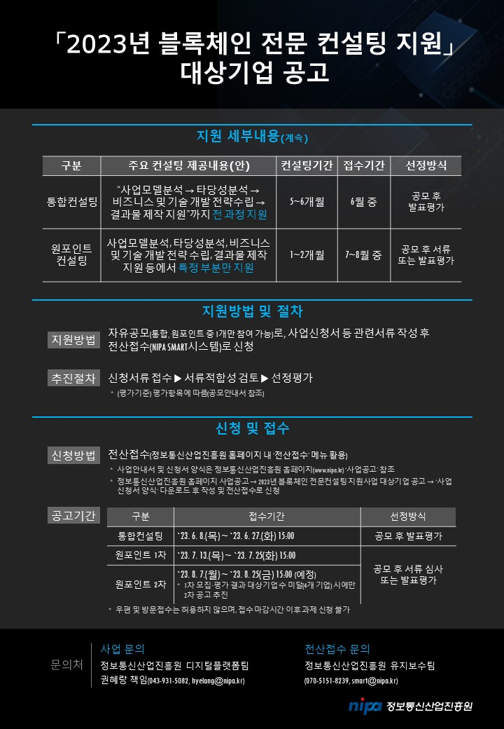 o 공고명 : 2023 블록체인 전문 컨설팅 지원사업 대상기업 공고 o 사업목적 : 블록체인 기술 도입을 희망하는 일반기업·지자체·공공기관 및 블록체인기술을 개발·활용해 비즈니스를 하는 기업, 글로벌 블록체인 시장에 진출코자 하는 기업 대상 맞춤형 컨설팅 제공 o 지원대상 : 블록체인 기술 도입을 희망하거나 사업을 진행하는 기관·기업 * 중소·중견기업 및 지자체 등 단독 또는 컨소시엄으로 참여 가능 o 공고기간 : 통합컨설팅(6월 8일~27일 15시) / 원포인트 컨설팅(7월 13일~25일 15시) o 지원내용 : 3개 분야(①블록체인 도입·활용, ②서비스개발 및 사업화 지원, ③ 글로벌 시장 사업진출 지원)에 대한 통합 또는 원포인트 컨설팅 지원 o 신청방법 : NIPA 홈페이지 내 '전산접수' 메뉴 활용하여 온라인 접수(첨부파일 참고) o 문의/연락처 - 사업문의 : NIPA 디지털플랫폼팀 권혜랑 책임(043-931-5082, hyelang@nipa.kr) - 전산접수 문의 : NIPA 유지보수팀(070-5151-8239, smart@nipa.kr) |